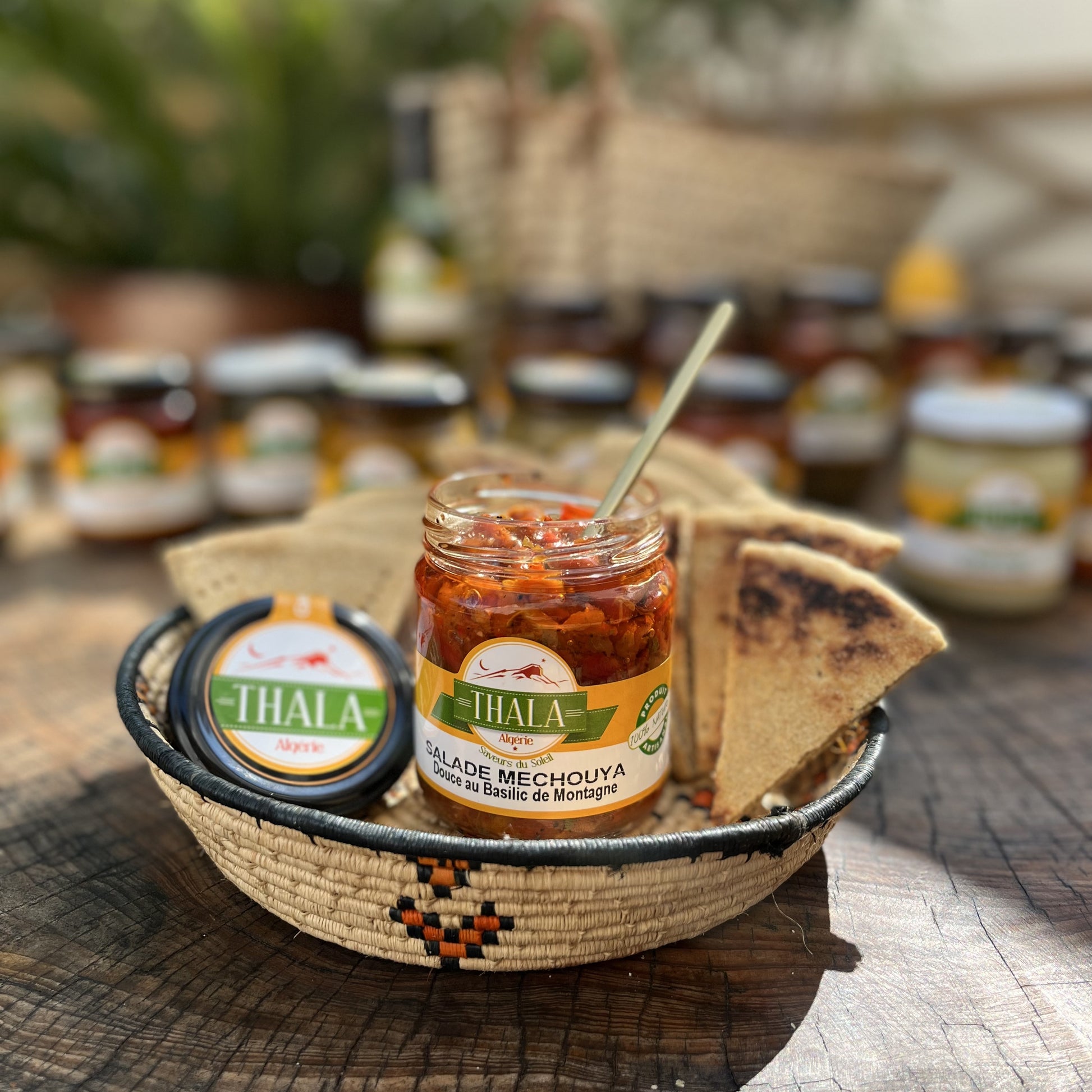 La Salade Mechouïa à la tomate séchée est une spécialité méditerranéenne. Thala la produit de manière artisanale avec des ingrédients naturels sélectionnés auprès d'agriculteurs Algériens. Nos salades Mechouïa sont cuisinées avec des poivrons cuits au feu de bois et pelés minutieusement.